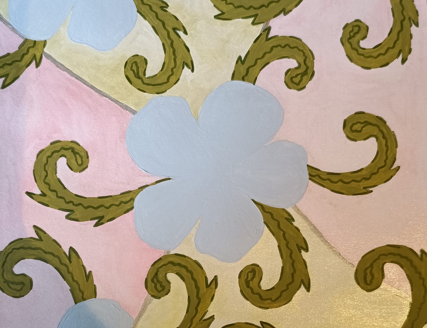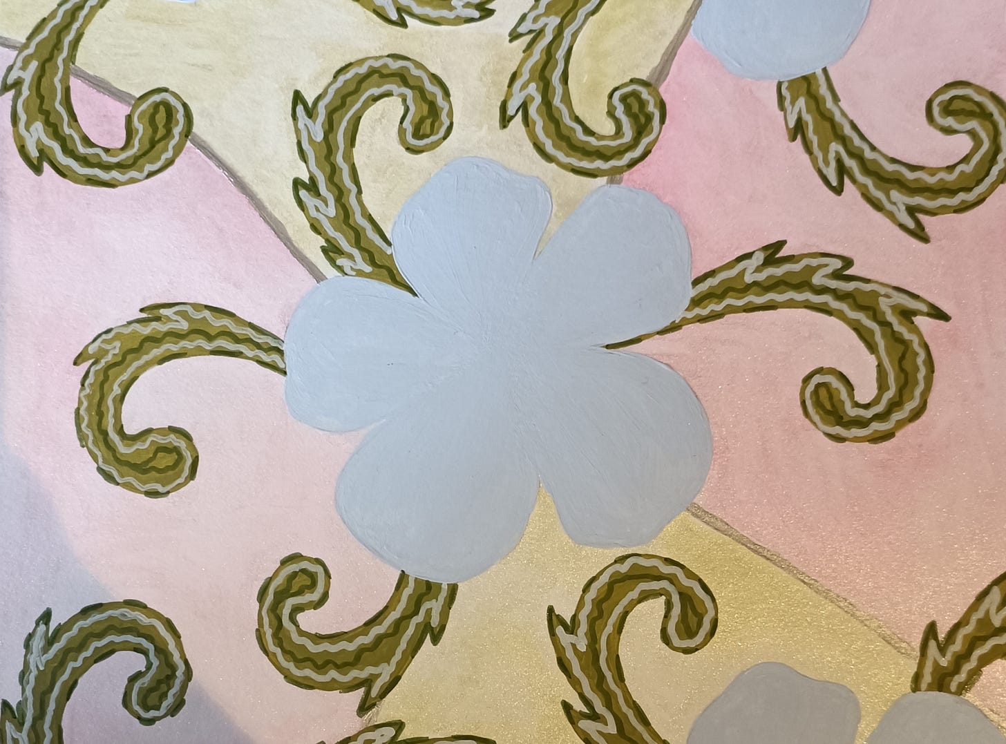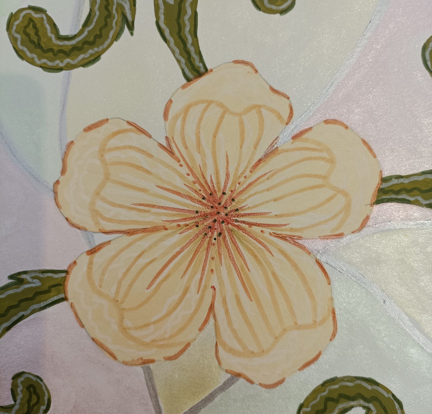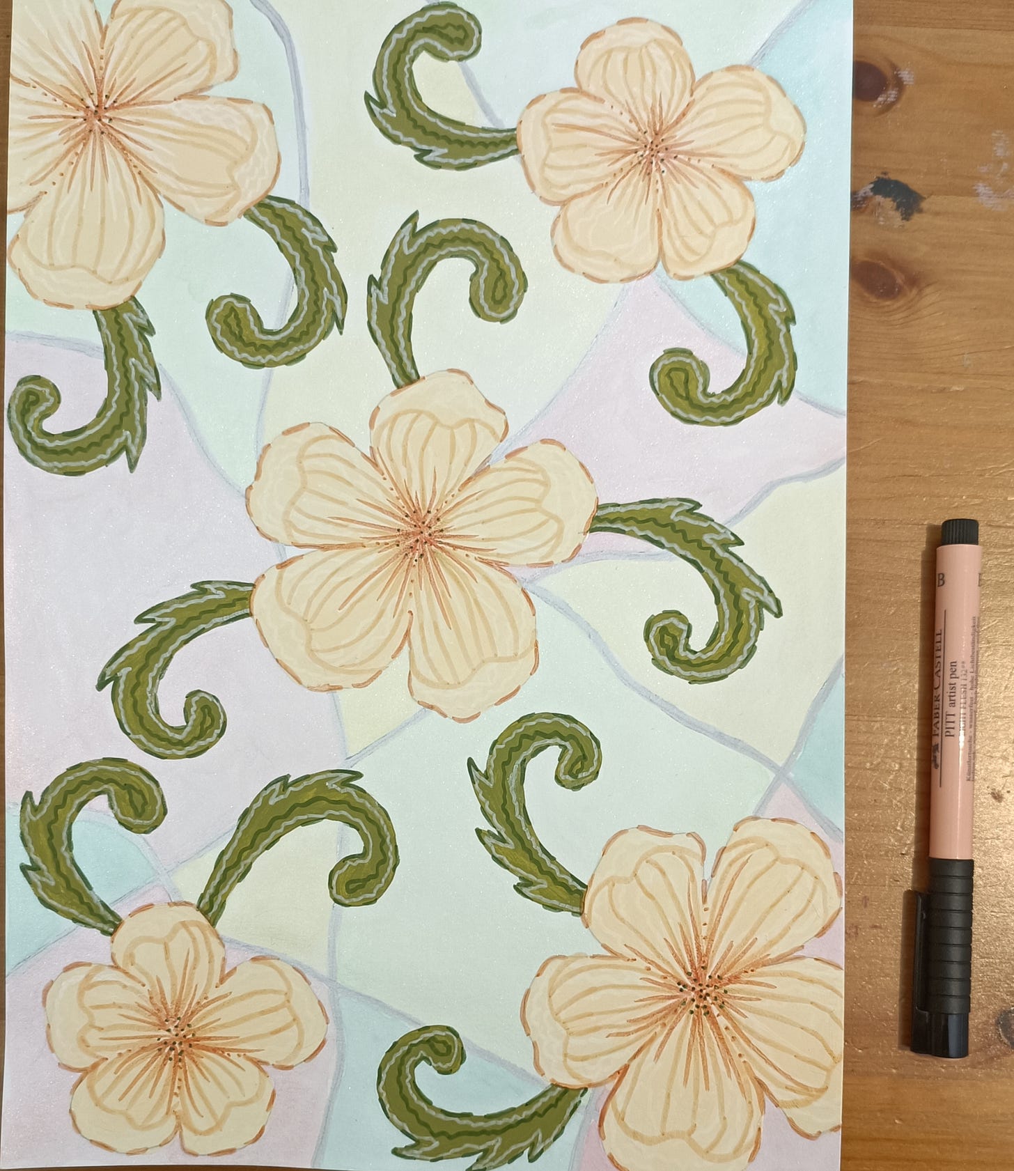17) Next I will use white marker to highlight green scrolls and petals on the flowers. This is the result.