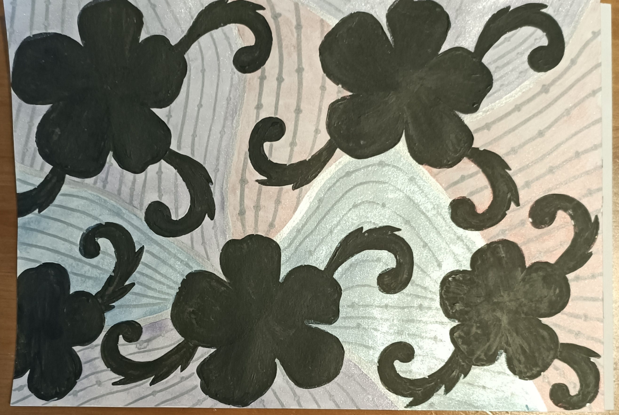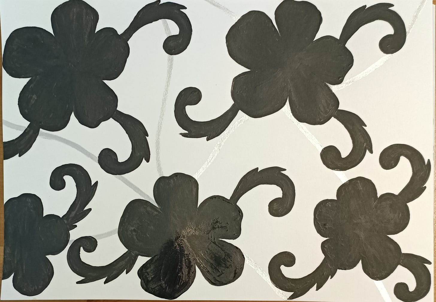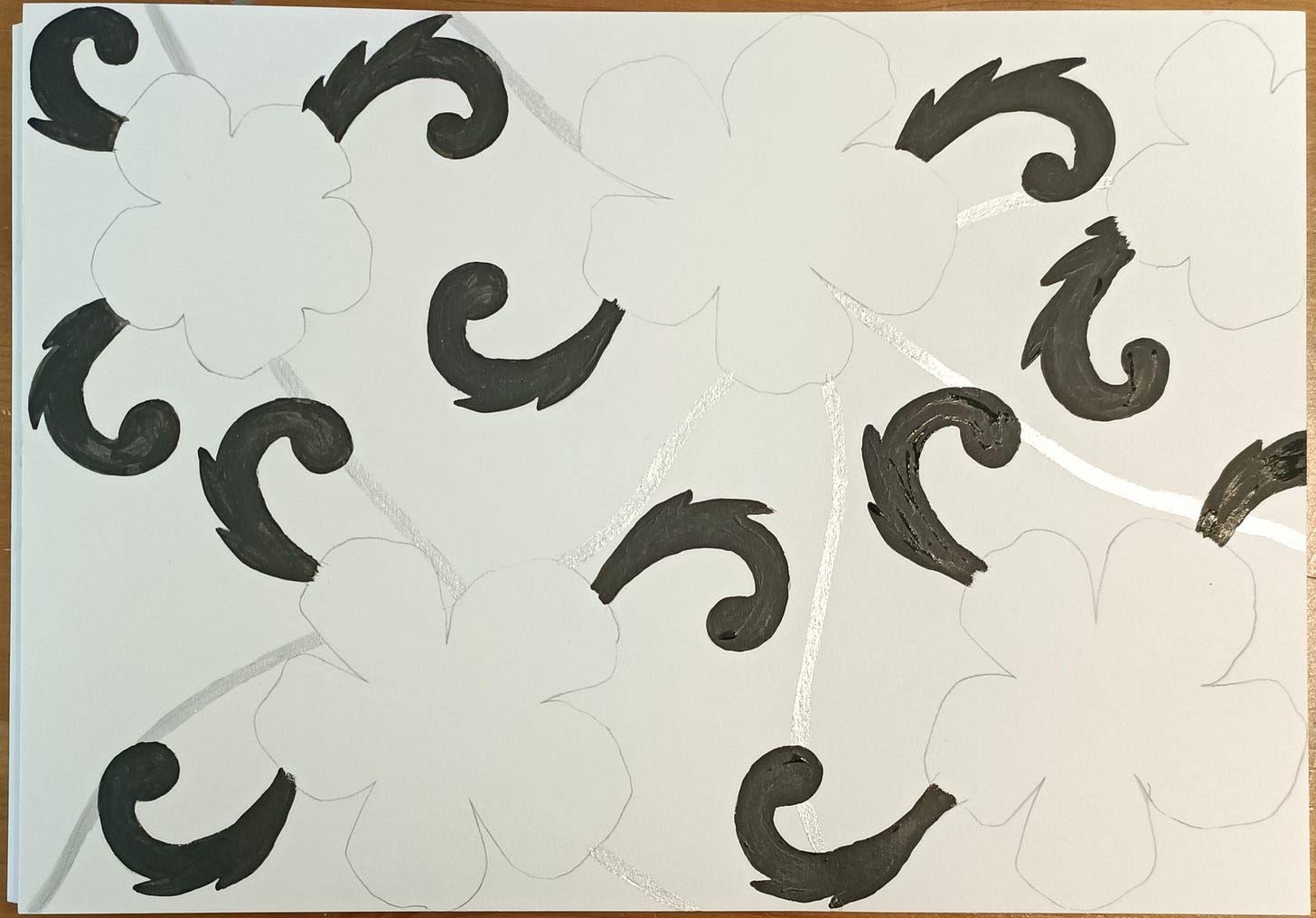 21) Next I’ve decided to make this design in black colours, so I drew first flowers and scrolls on the part paper as well uneven lines in the background.