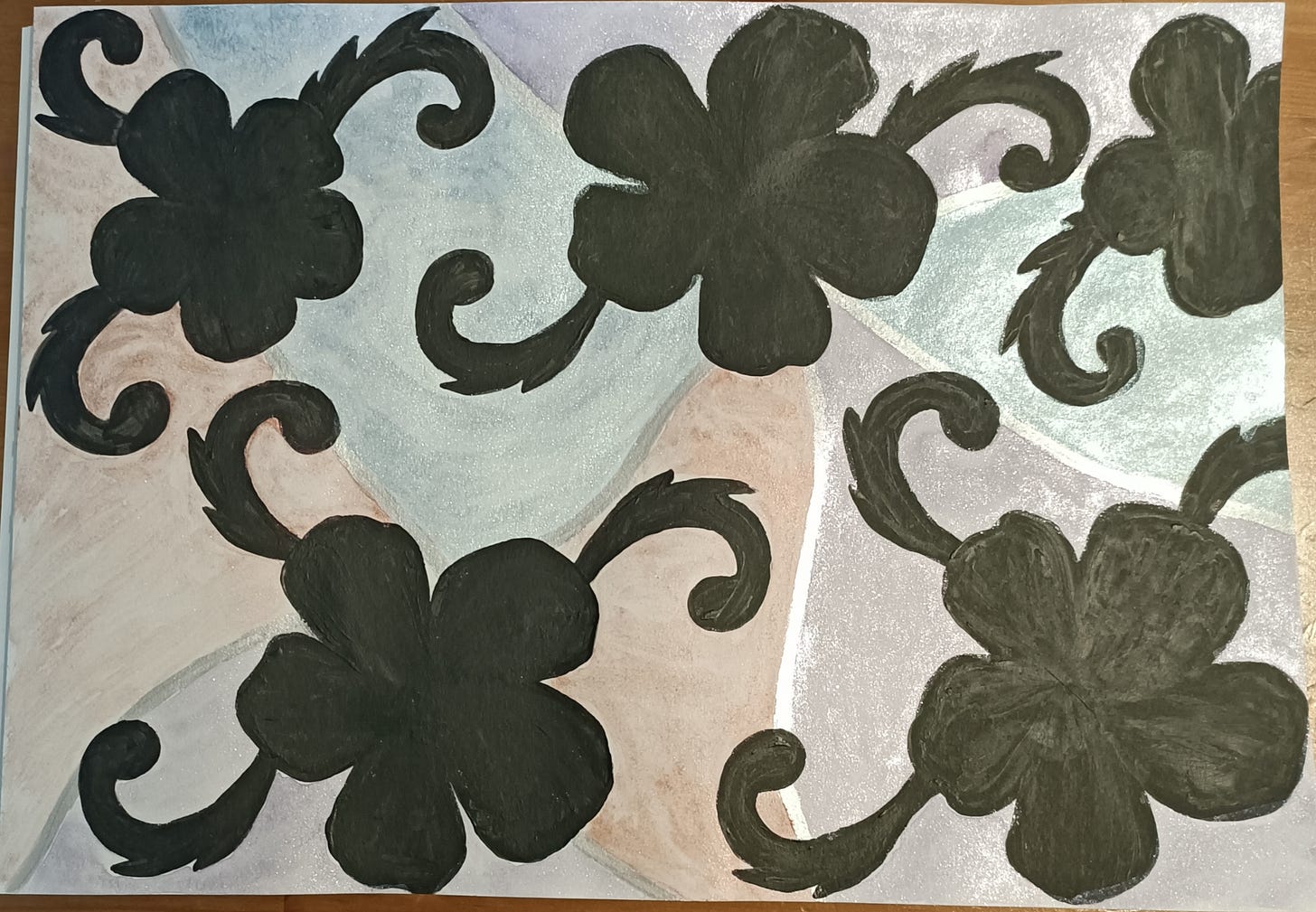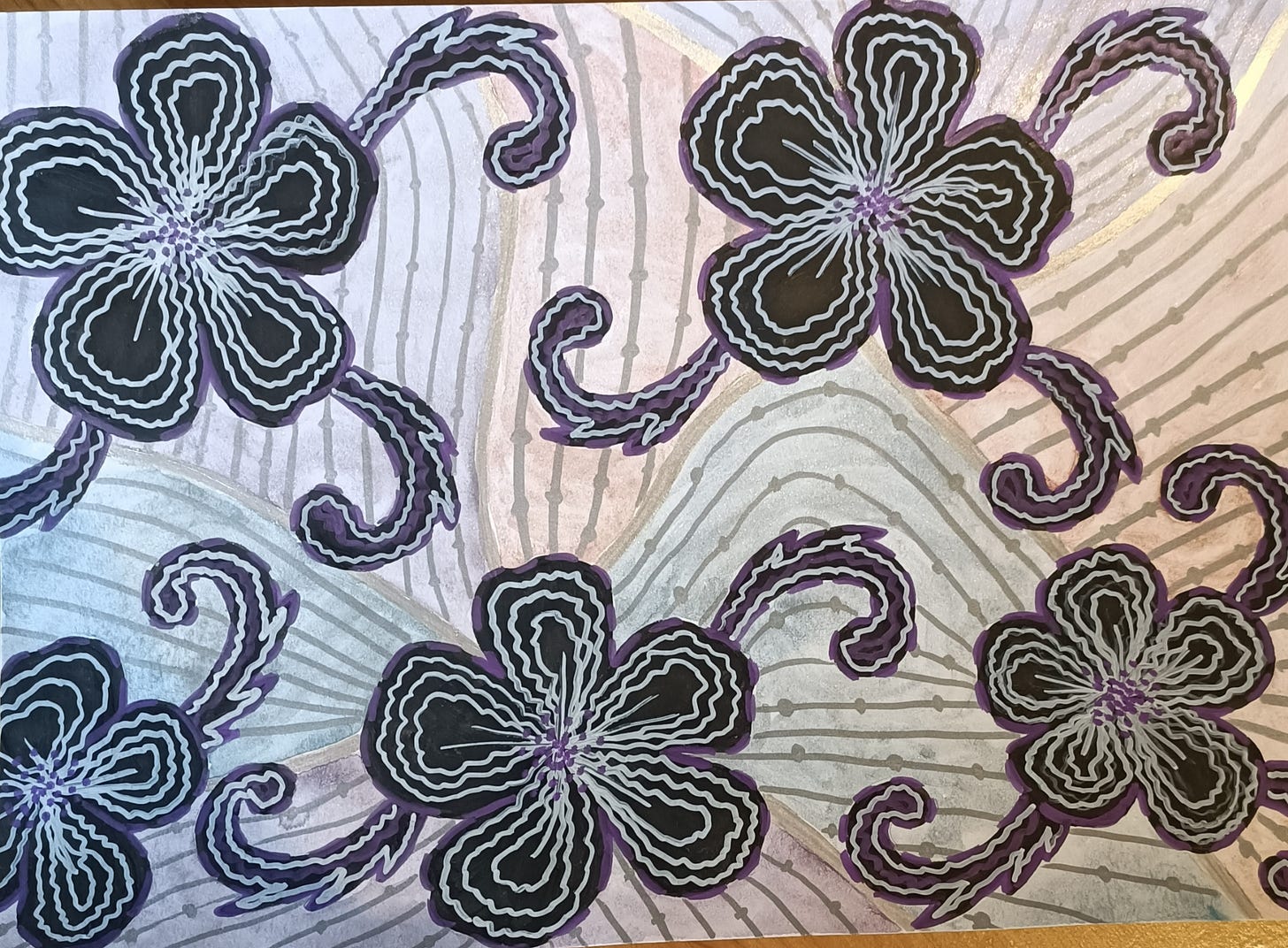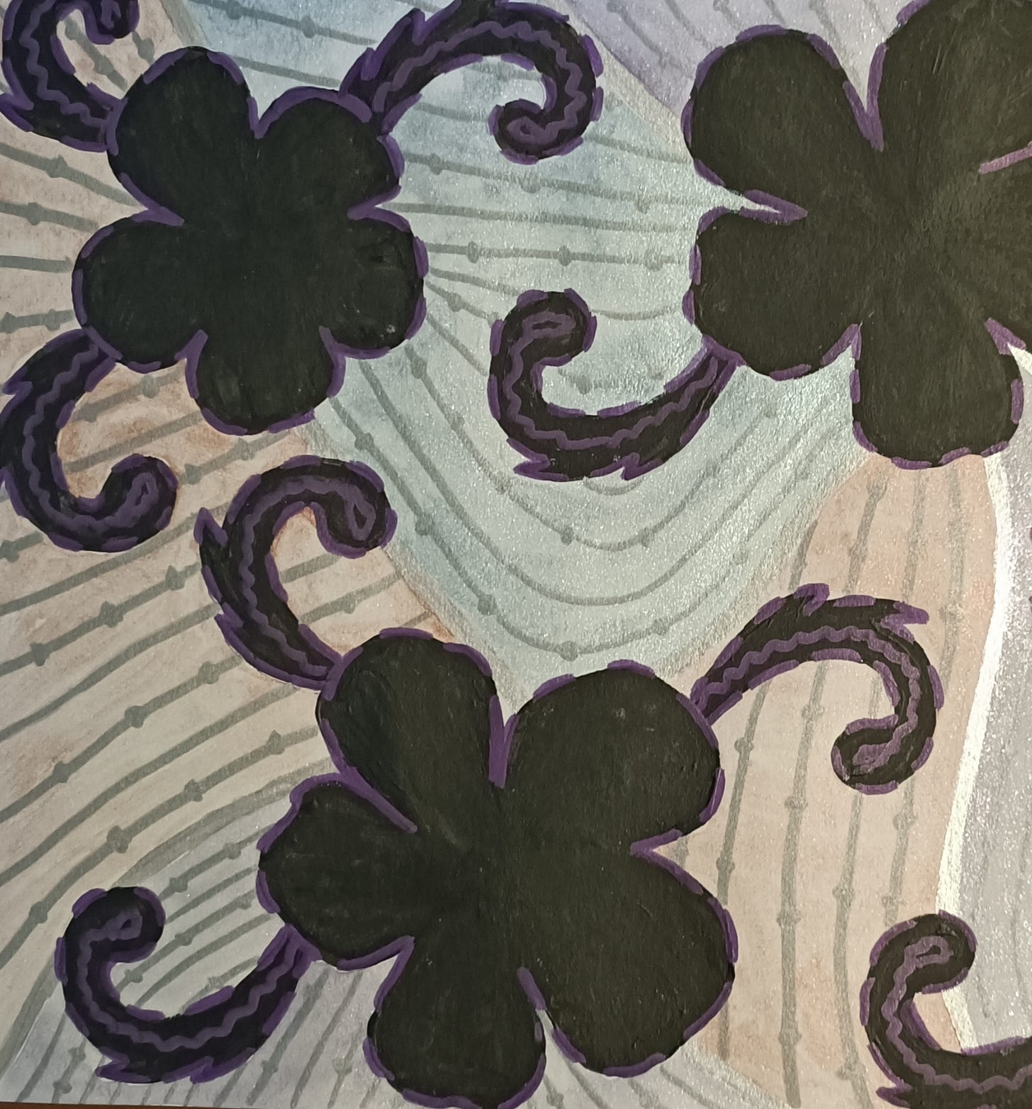 21) Next I’ve decided to make this design in black colours, so I drew first flowers and scrolls on the part paper as well uneven lines in the background.