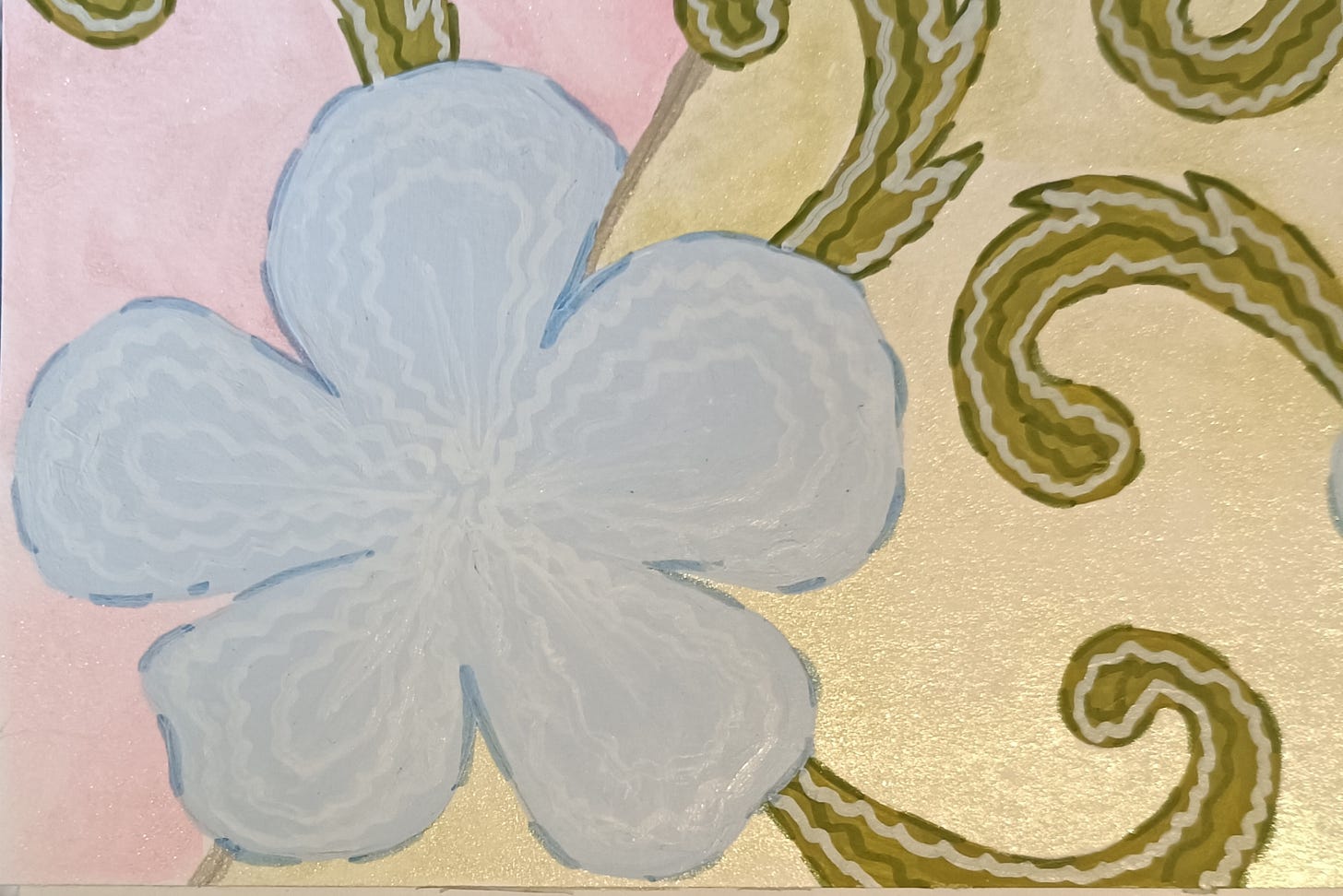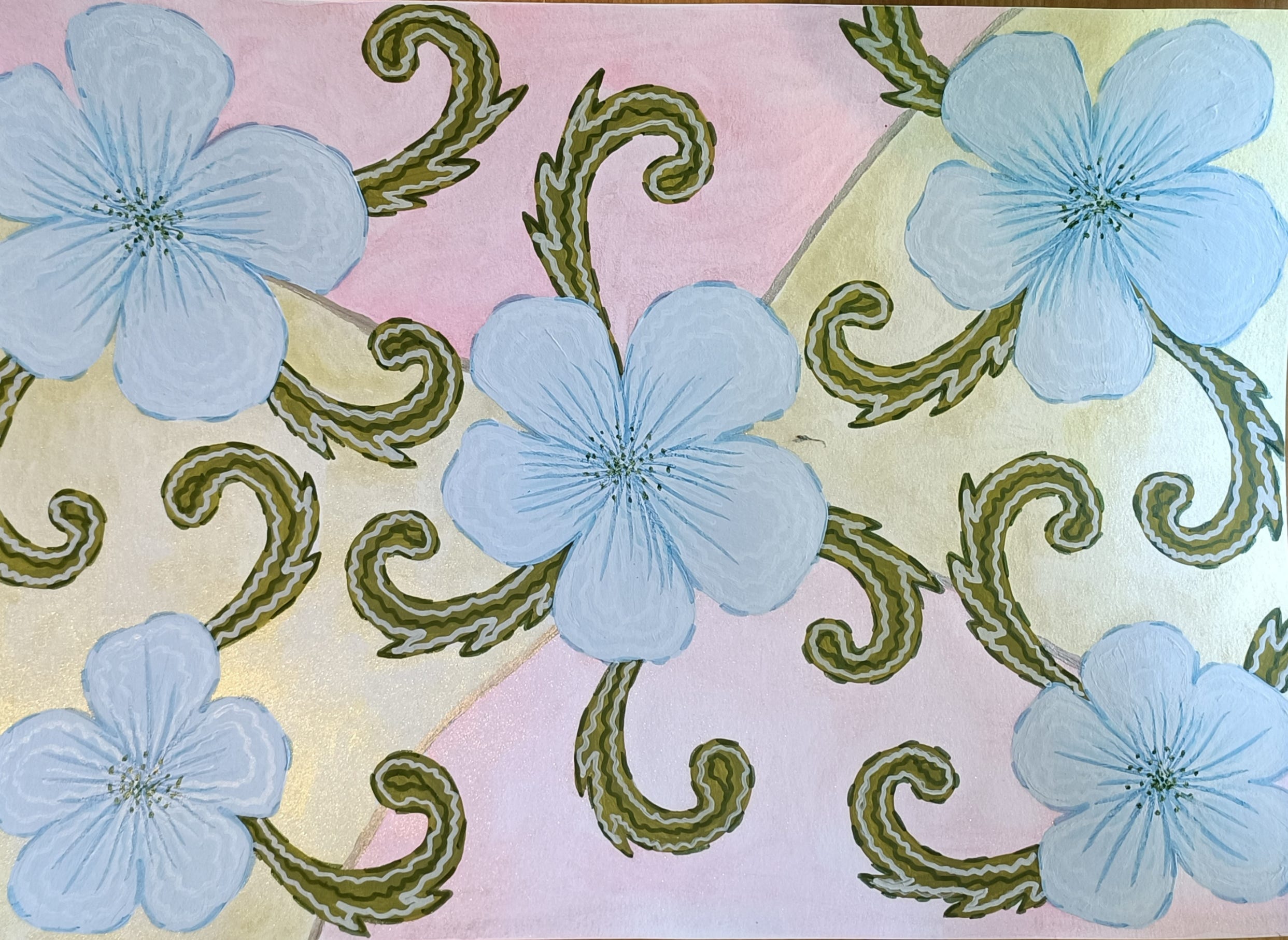 29) Next I will make a similar design but instead of beige flowers I will draw blue flowers. I draw flowers with scrolls and uneven lines in the background, using art paper and pencil.