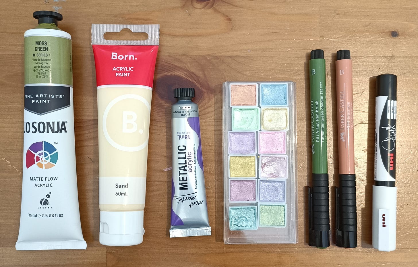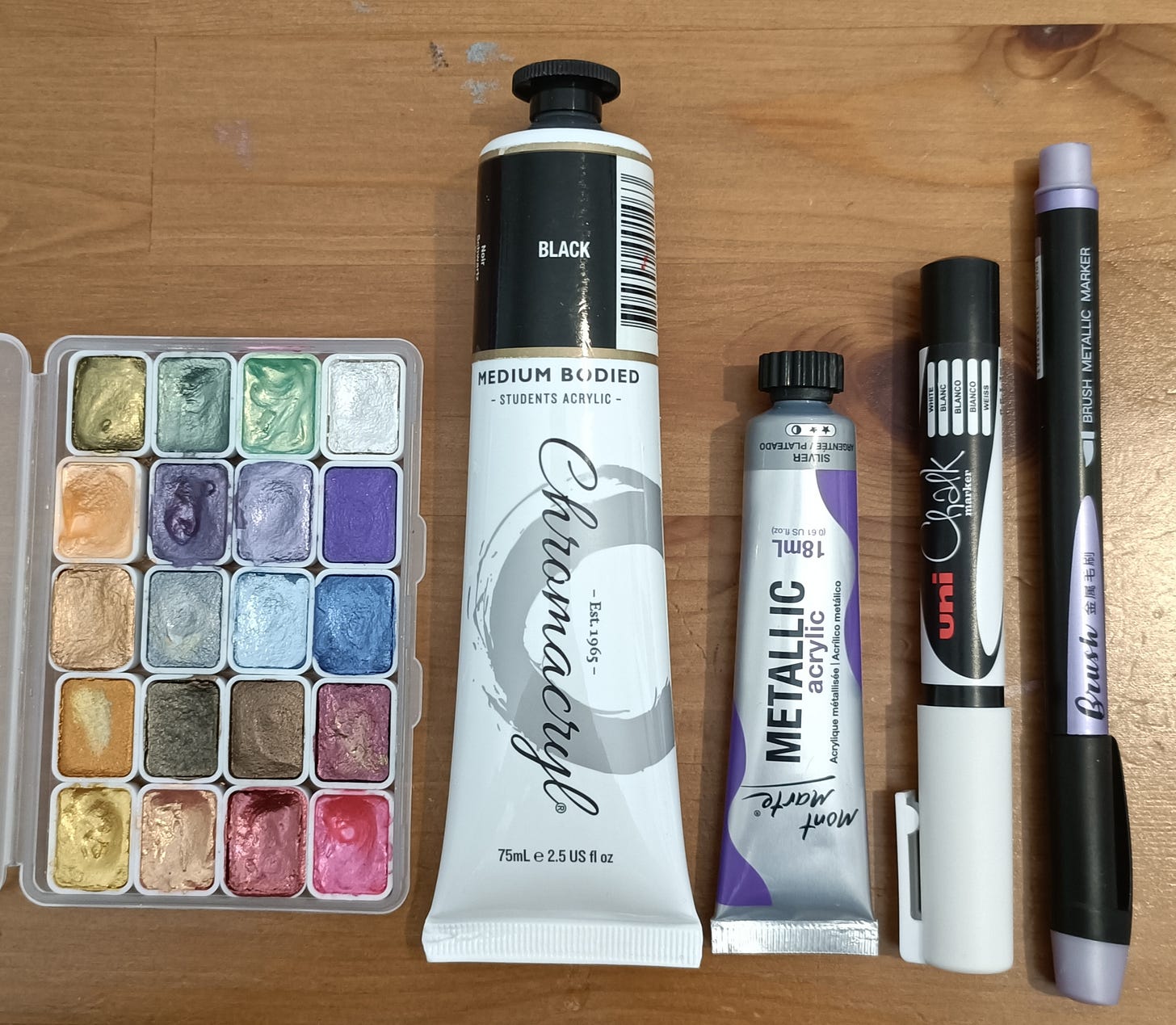 22) I will use 2 shades of acrylic paints, metallic watercolours, 2 shades of metallic marker and white marker.