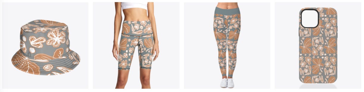 Orange flowers and leaves on hat, shorts, tights and iPhone case.