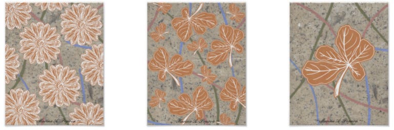 10) Next I will use the same approach to create handmade drawings which I will use for Art Prints and planners. Using the same technique as for orange flowers and leaves, I drew these 2 flowers in smaller and larger sizes and 1 double-sided scroll. I cut out shapes and I will use them as stencils for my drawings.