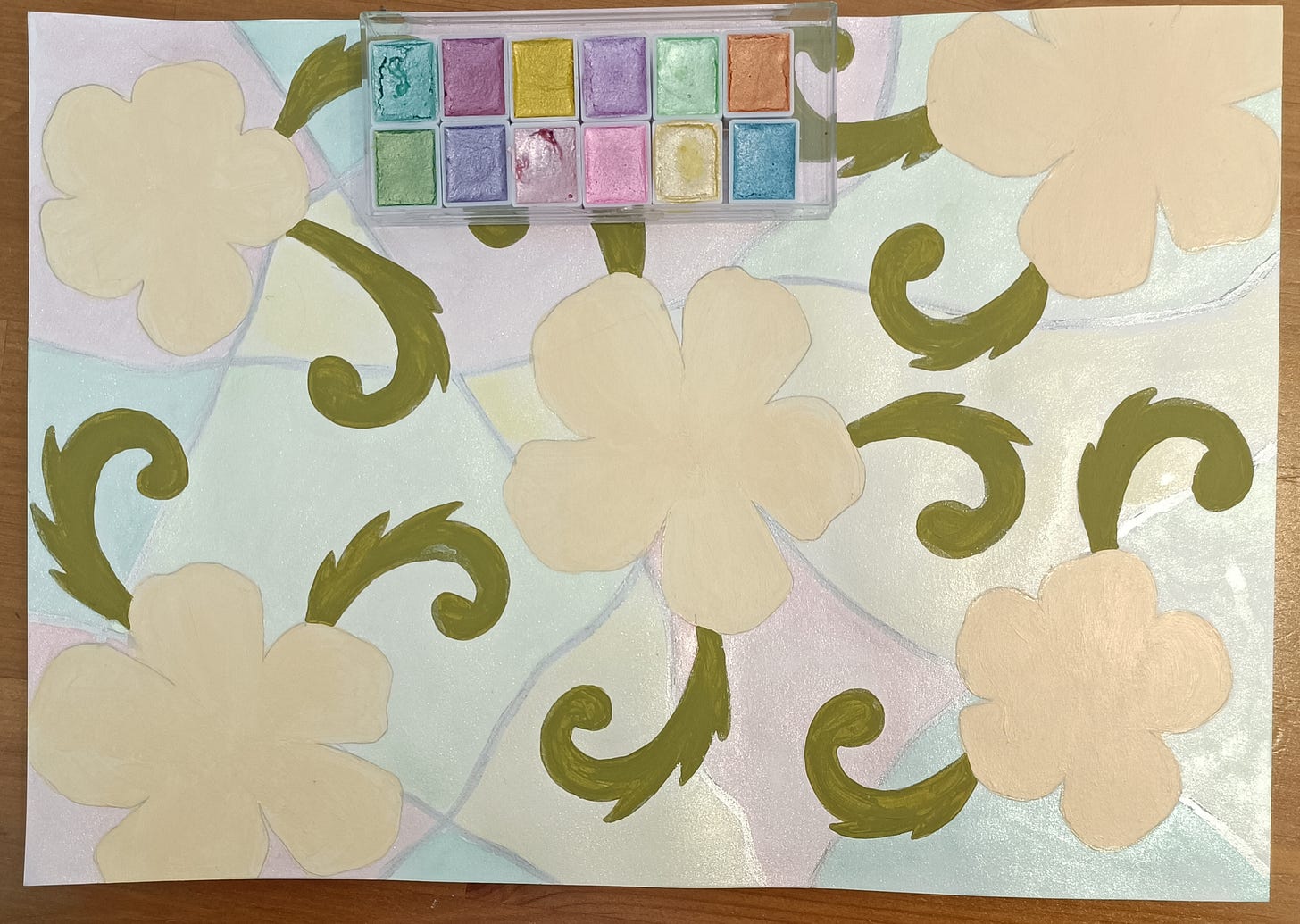 16) Next I will use light green, light yellow, light pink and light blue metallic watercolours to fill in uneven shapes at the background.